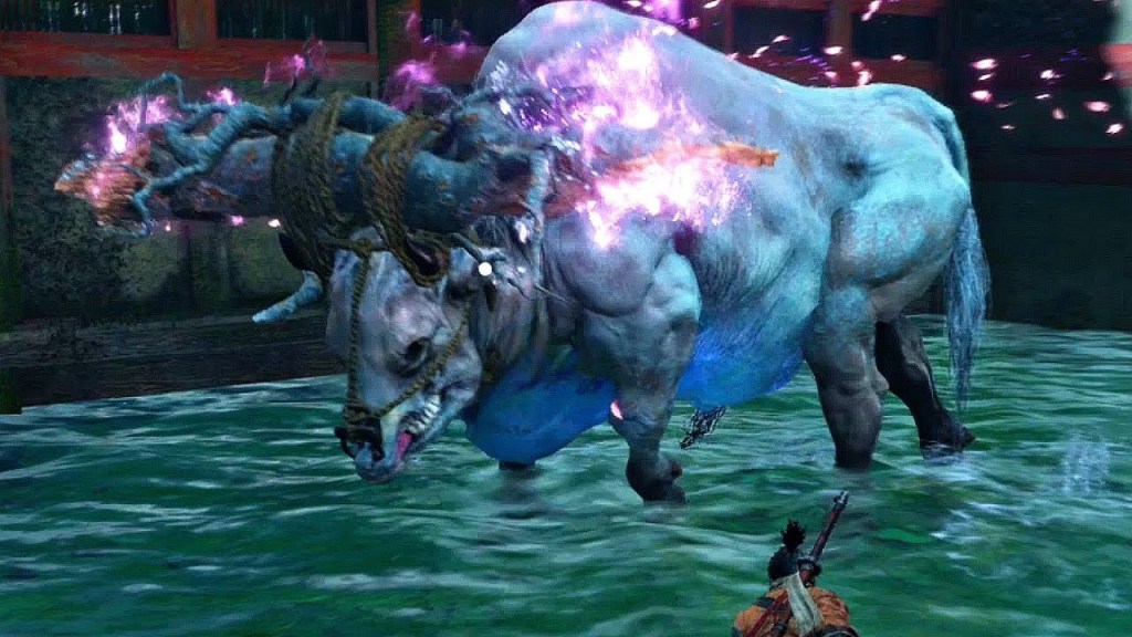 Il toro fiammeggiante ha un sacco di HP, però ha una sola barra della salute e non può bloccare nessuno dei nostri attacchi. Di contro, però anche noi non potremo parare i suoi: anche se li blocchiamo, subiremo comunque qualche danno. È importante tenere a mente che il Toro può colpirci solamente con le corna, il suo attacco base sarà caricarci e attaccarci con le stesse piantando i piedi per terra; bisogna stare attenti all’attacco che oneshotta, quello in cui fende il terreno con le corna: teniamo sempre le distanze. La regola generale è: mai schivare lateralmente, ma correre intorno al toro in una sorta di “inseguimento” per portarci quando possibile alle sue spalle; le Castagnole Shinobi lo stordiscono per svariati secondi, dandoci il tempo di curarci o di attaccarlo con calma. Questo è il primo scontro di Sekiro in cui occorre concentrarsi sulla vitalità e non sulla postura; ricordate: la fretta e i rischi inutili sono pessimi compagni di viaggio per affrontare questo boss.