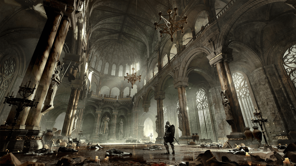 Così come i camminamenti ristretti sono teatro di imboscate, gli ampi saloni sono scenari perfetti per duelli titanici. Le gigantesche sentinelle che controllano l’ingresso ci accolgono, non reagiscono alla nostra presenza, a meno che non percepiscano evidente ostilità. E a quel punto, iniziano scontri epici, dove le imponenti armi dei nemici compiono rotazioni e fendenti poderosi, sfruttando tutto lo spazio a disposizione; armi scintillanti sotto la luce trasmessa da magnifiche vetrate. L’arte gotica diviene parte fondante del gameplay e arricchisce una lore già traboccante.